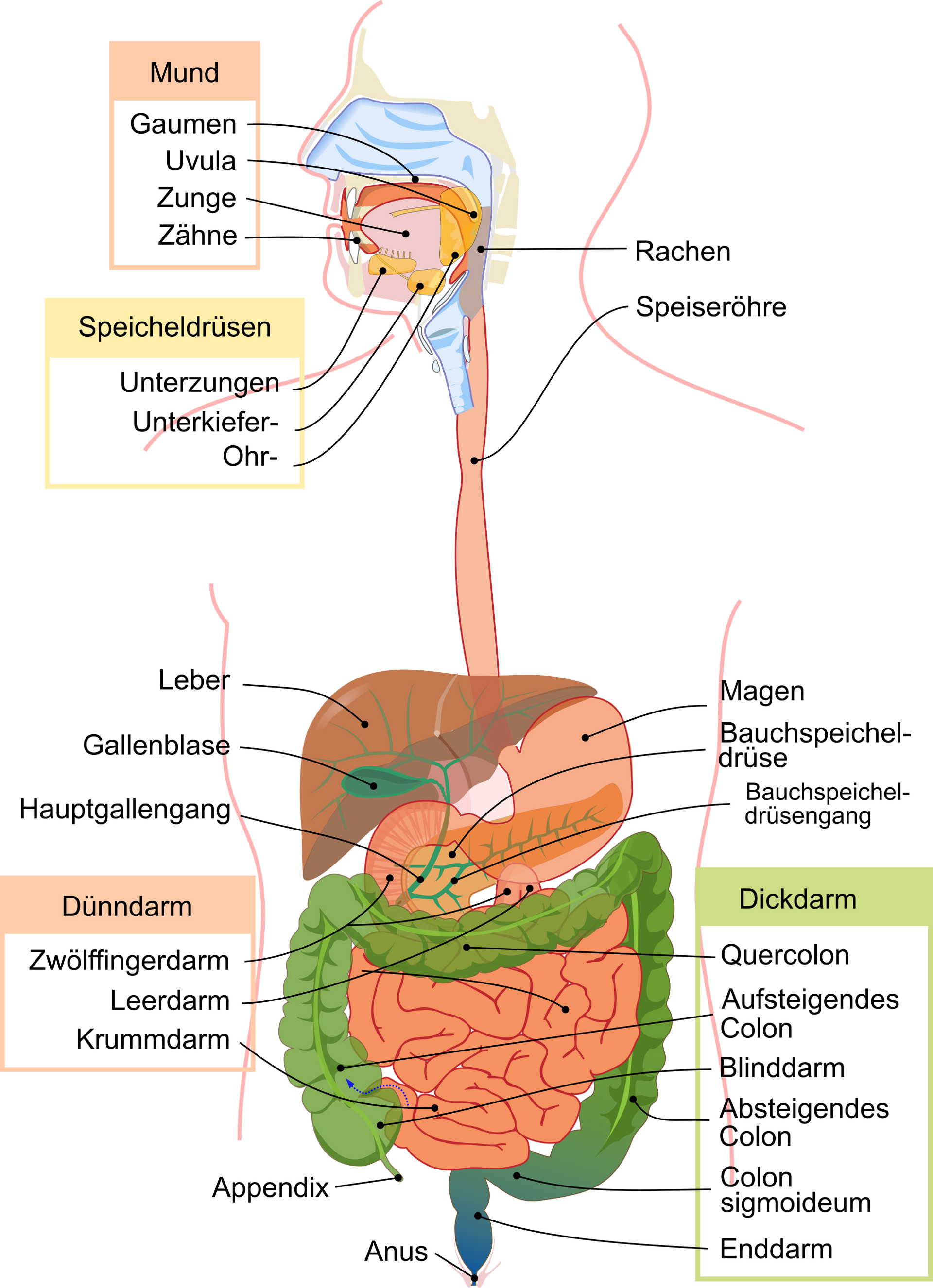 Im Verdauungstrakt findet der eigentliche enzymatische Aufschluss der Nahrung, die Resorption von Nahrungsstoffen und Wasser sowie die Ausscheidung unverdaulicher oder nicht verwertbarer Nahrungsbestandteile statt. Neben Enzymen sind auch verschiedene Mikroorganismen an der Verdauung beteiligt, die man unter dem Begriff Darmflora zusammenfasst.